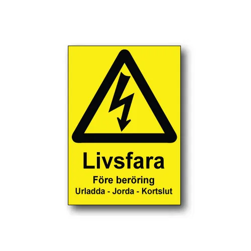 Skylt / Livsfara Före beröring urladda jorda kortslut