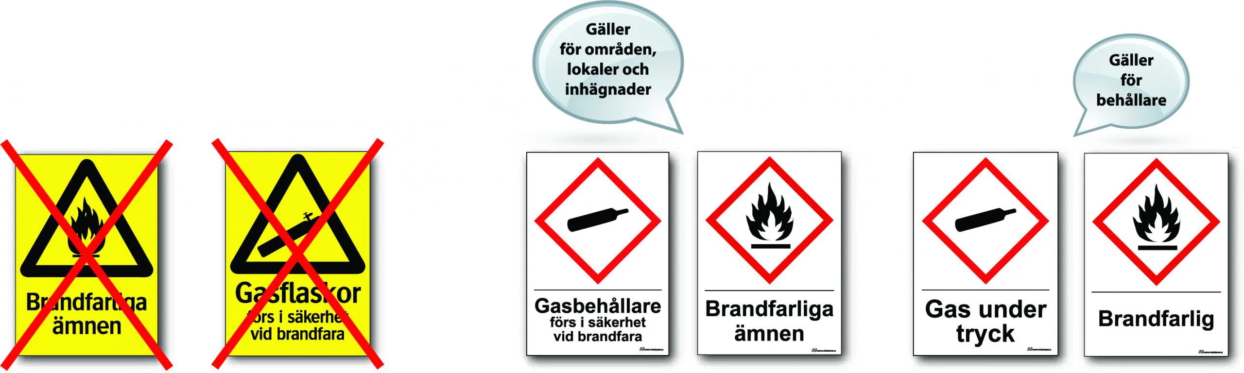 Tidigare användes varningsskyltar och dekaler i gul/svart färgsättning även för kemiska risker. Dessa utföranden är inte längre tillåtna. I dag ska farosymboler istället utformas enligt CLP, vilket innebär en vit bakgrund med svart symbol som omges av en röd romb.